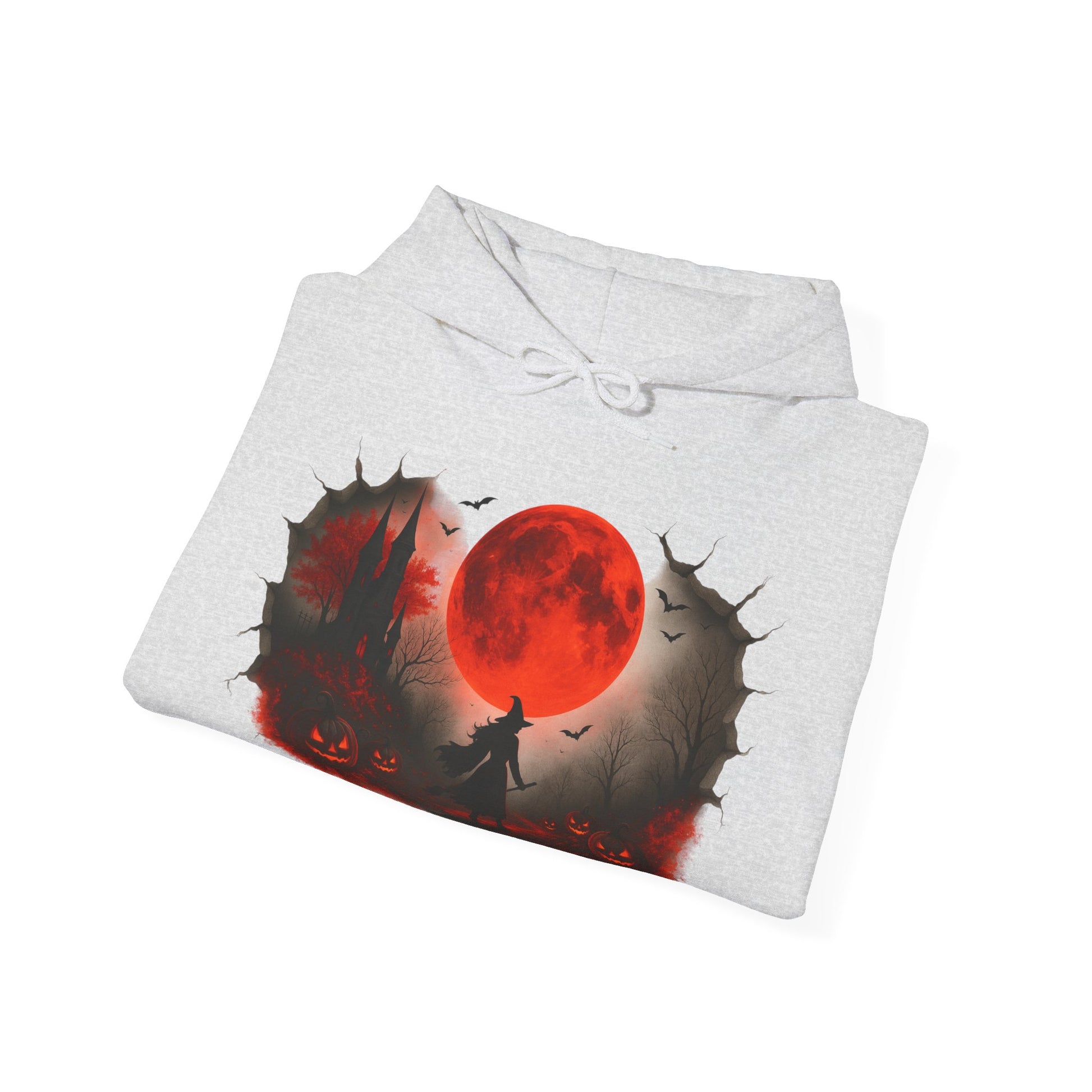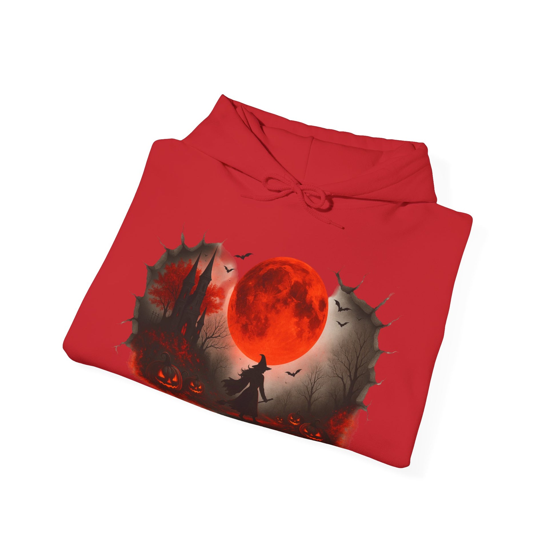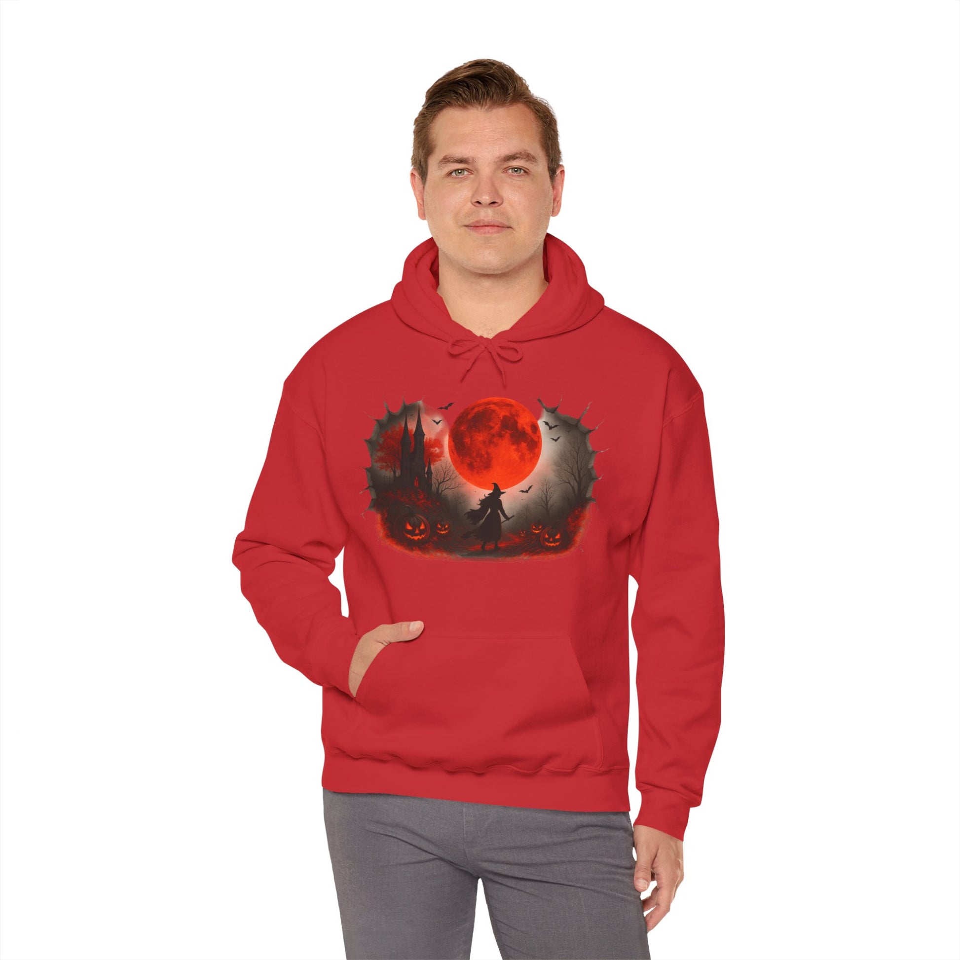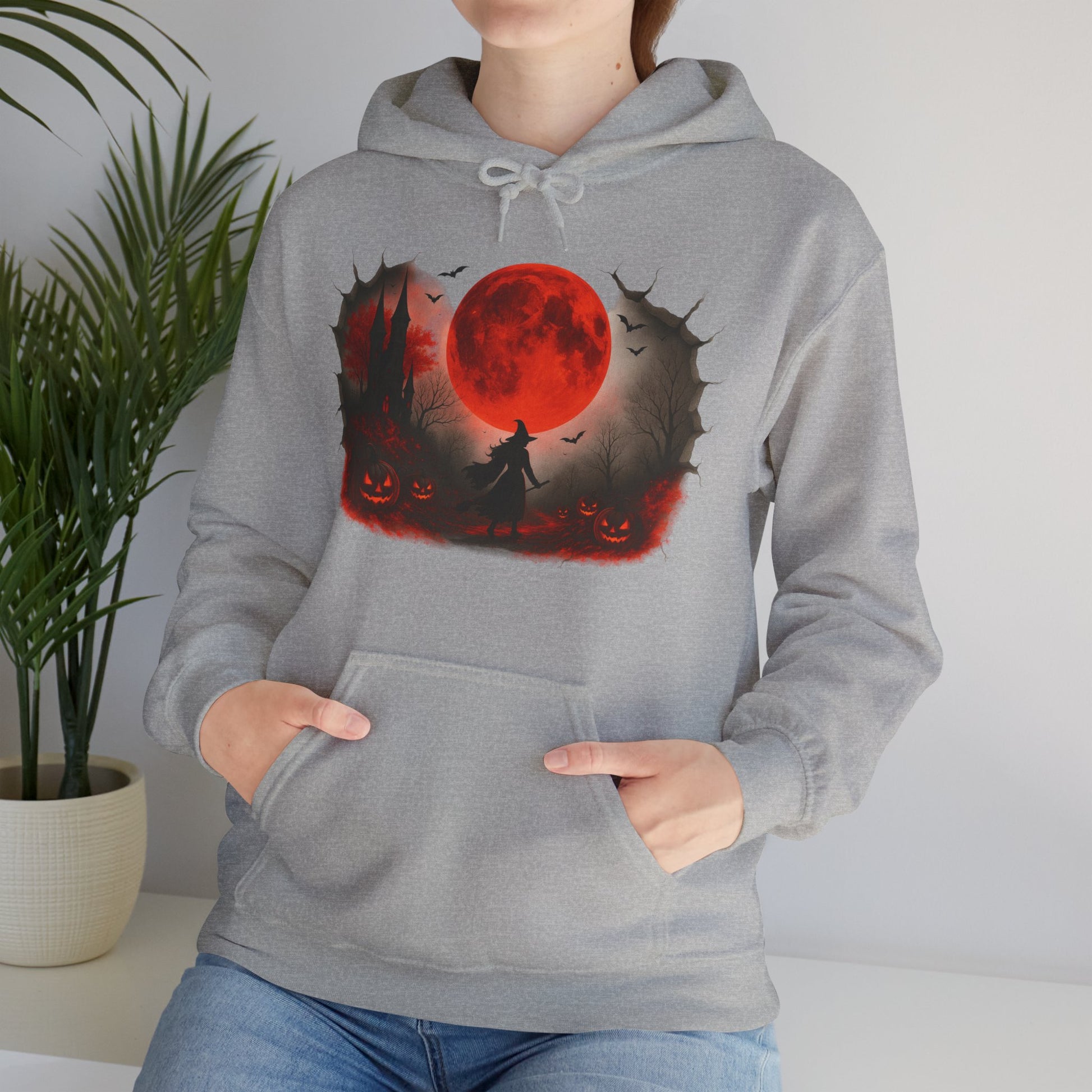 Step into spooky season with this Unisex Halloween witch hoodie, featuring a bold design of a witch under a glowing red moon with pumpkins, bats, and a haunted castle. Made from a soft, heavy blend fabric, this spooky sweatshirt keeps you warm on chilly autumn nights while showcasing your love for Halloween style. Perfect for trick-or-treating, costume parties, or casual fall outfits, this red moon hoodie blends comfort and festive flair. This cozy Unisex Heavy Blend™ Hooded Sweatshirt also makes a unique Halloween gift for witches, gothic fashion fans, and pumpkin lovers. Pair this witch sweatshirt with jeans, leggings, or joggers for a cozy, stylish seasonal look.