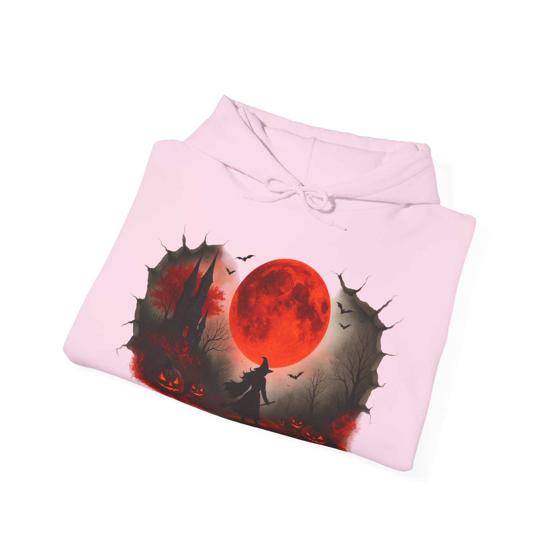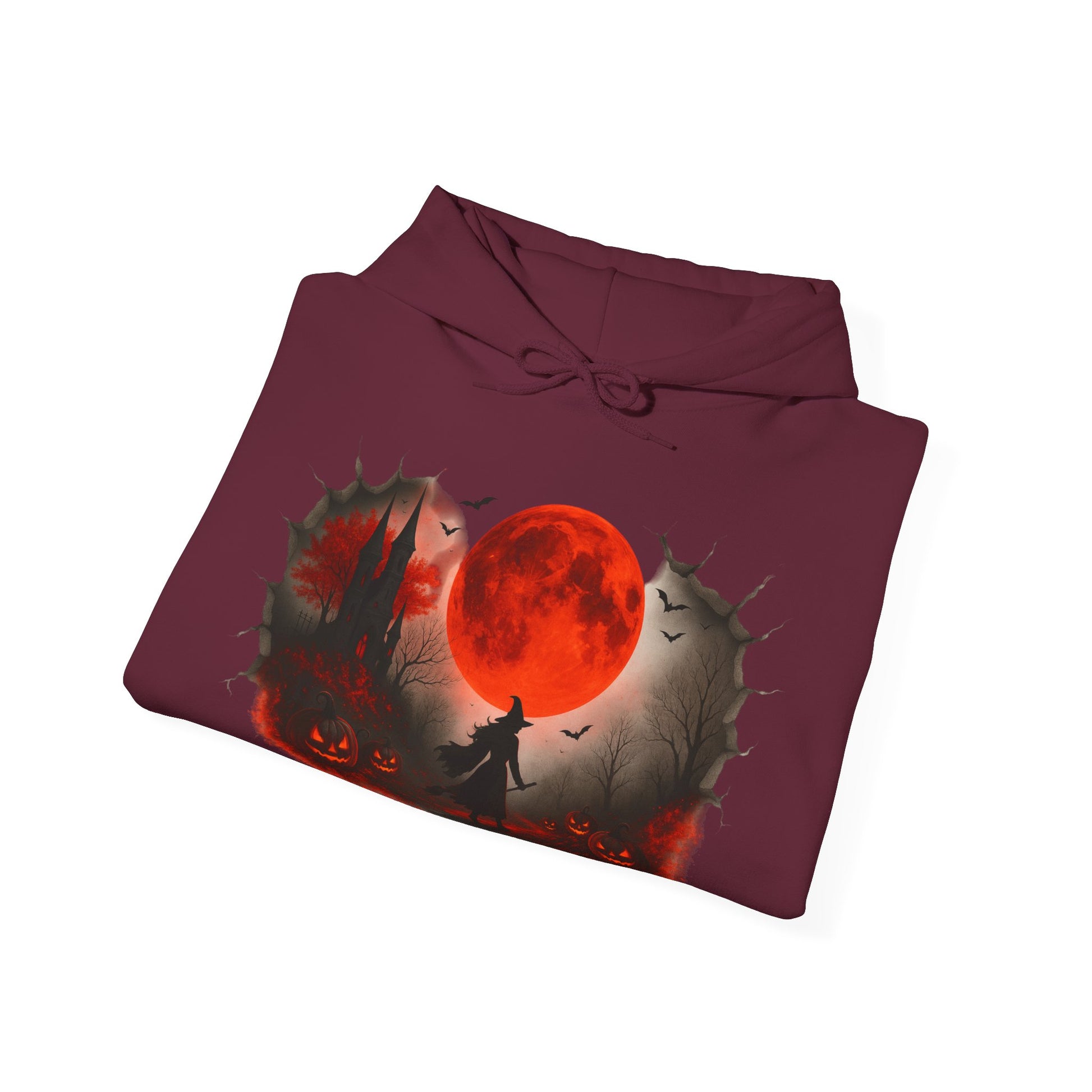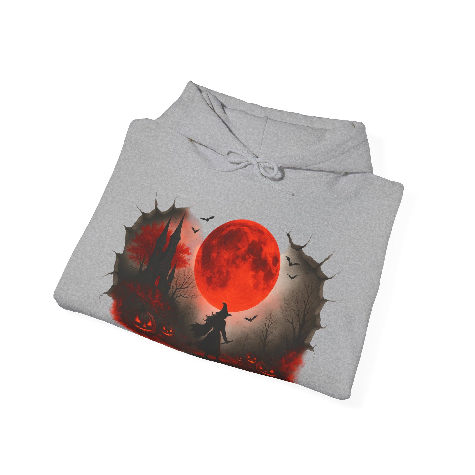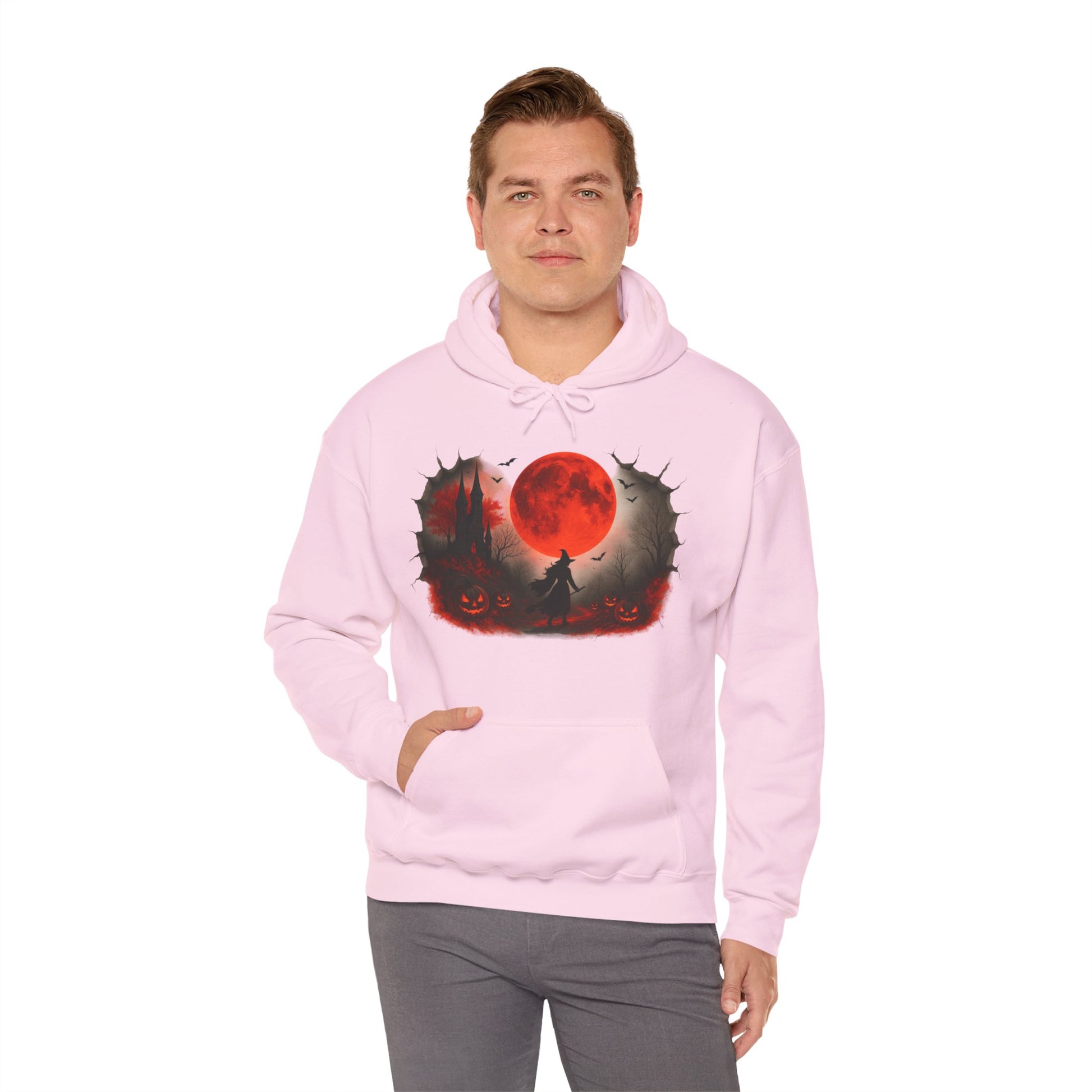 Step into spooky season with this Unisex Halloween witch hoodie, featuring a bold design of a witch under a glowing red moon with pumpkins, bats, and a haunted castle. Made from a soft, heavy blend fabric, this spooky sweatshirt keeps you warm on chilly autumn nights while showcasing your love for Halloween style. Perfect for trick-or-treating, costume parties, or casual fall outfits, this red moon hoodie blends comfort and festive flair. This cozy Unisex Heavy Blend™ Hooded Sweatshirt also makes a unique Halloween gift for witches, gothic fashion fans, and pumpkin lovers. Pair this witch sweatshirt with jeans, leggings, or joggers for a cozy, stylish seasonal look.
